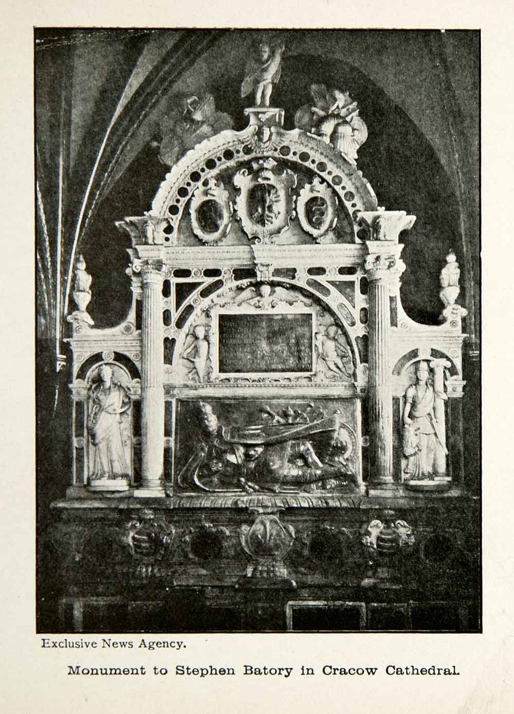 This is an original 1916 black and white halftone print of a monument to Stephen Batory in the Krakow Cathedral of Poland (Polska).