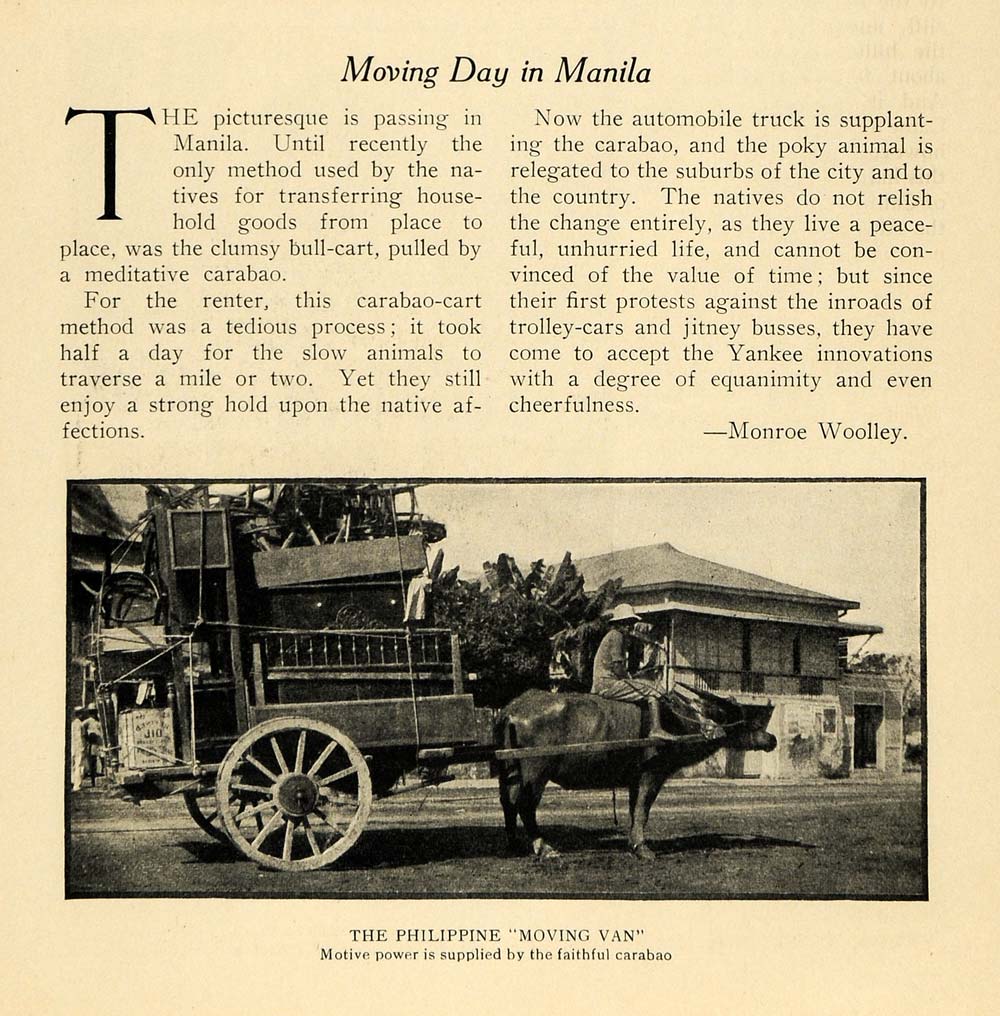 This is an original 1916 halftone print of "Moving Day in Manila," by Monroe Woolley. The article writes, "The picturesque is passing in Manila. Until recently the only method used by the natives for transferring household goods from place to place, was the clumsy bull-cart, pulled by a meditative carabao."
