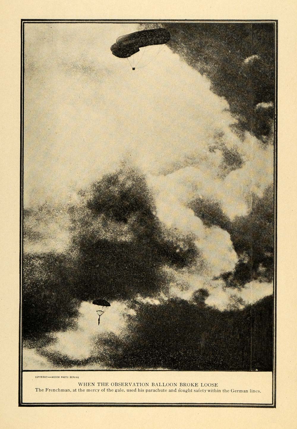 This is an original 1916 halftone print of a Frenchman parachuting down from an observation balloon. The caption reads, "The Frenchman, at the mercy of the gale, used his parachute and sought safety within the German lines."