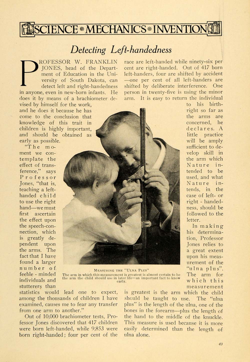 This is an original 1916 halftone print article titled, "Detecting Left-Handedness." The article features an image of Professor W. Franklin Jones who is the head of the Department of Education of the University of South Dakota. The article writes, "Out of 10,000 brachiometer tests, Professor Jones discovered taht 417 children were born left-handed, while 9,853 were born right-handed; 4% of the race are left-handed while 96% are right-handed."