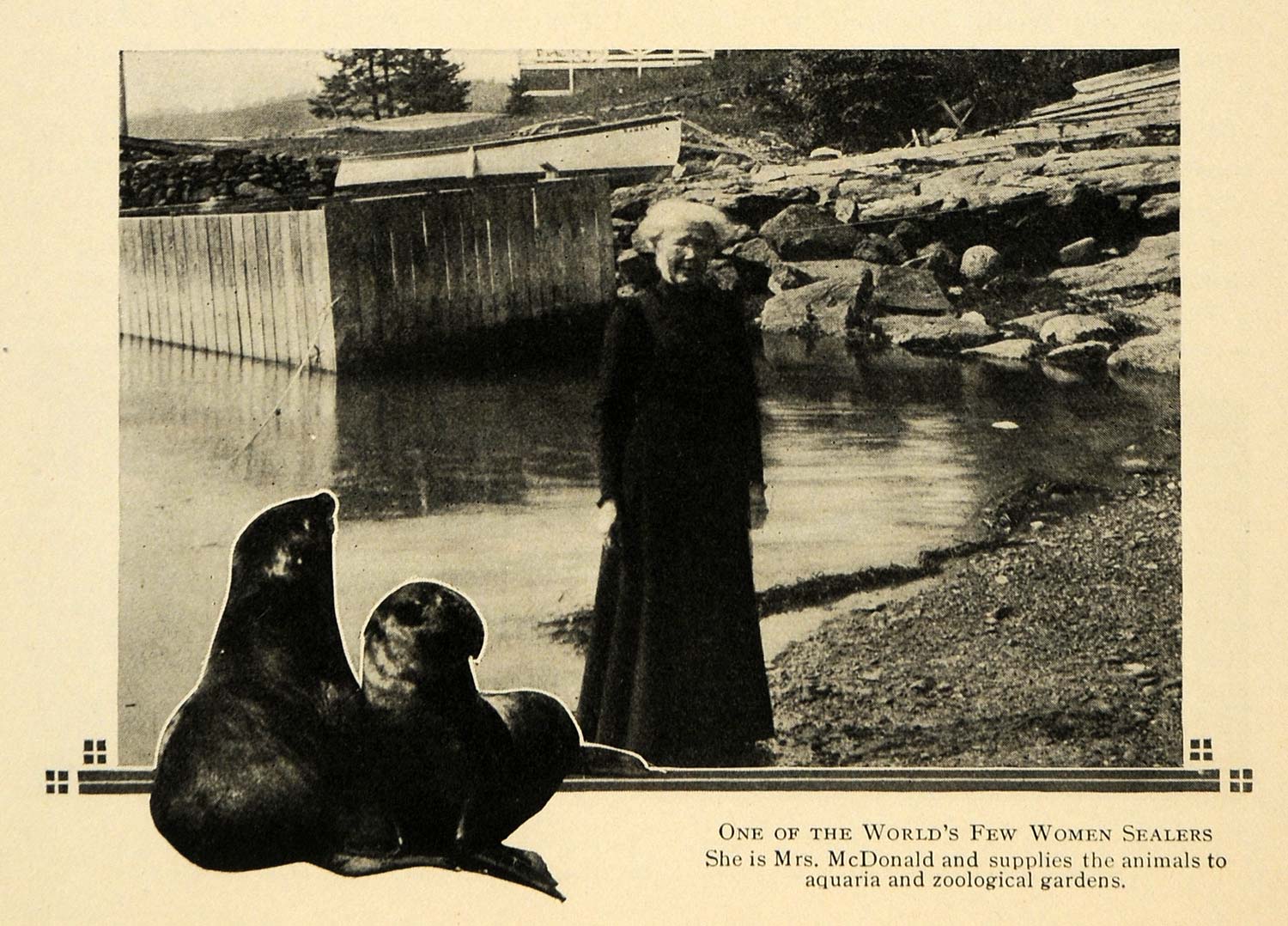 This is an original 1916 halftone print of Mrs. Janet McDonald-- one of the world's few women sealers. She supplied the animals to aquaria and zoological gardens. She would give fresh fish to her captured seals. Little by little, she would get the seals to eat dead fish, so it would be easier for the zoos to take care of them.