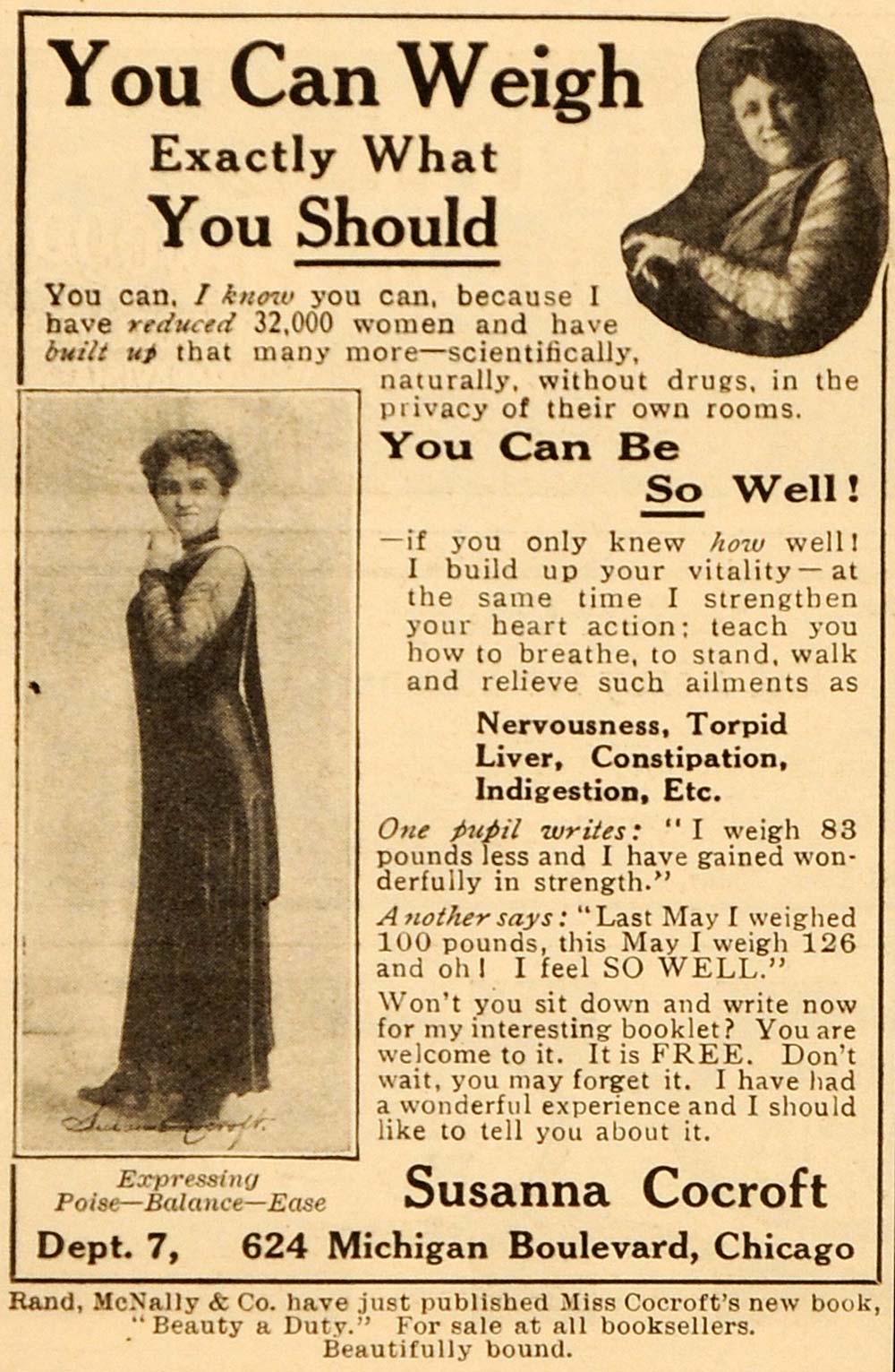 This is an original 1916 black and white print ad for a weight loss treatment from Susanna Crocroft, 624 Michigan Boulevard, Chicago.
