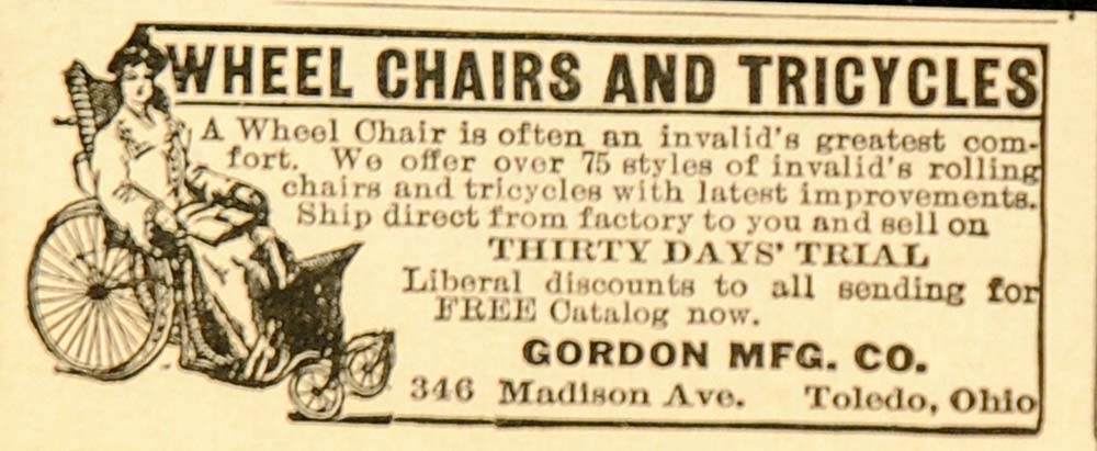 This is an original 1916 black and white print ad for Wheelchairs and Tricycles from the Gordon Mfg. Co., 346 Madison Ave., Toledo, Ohio.