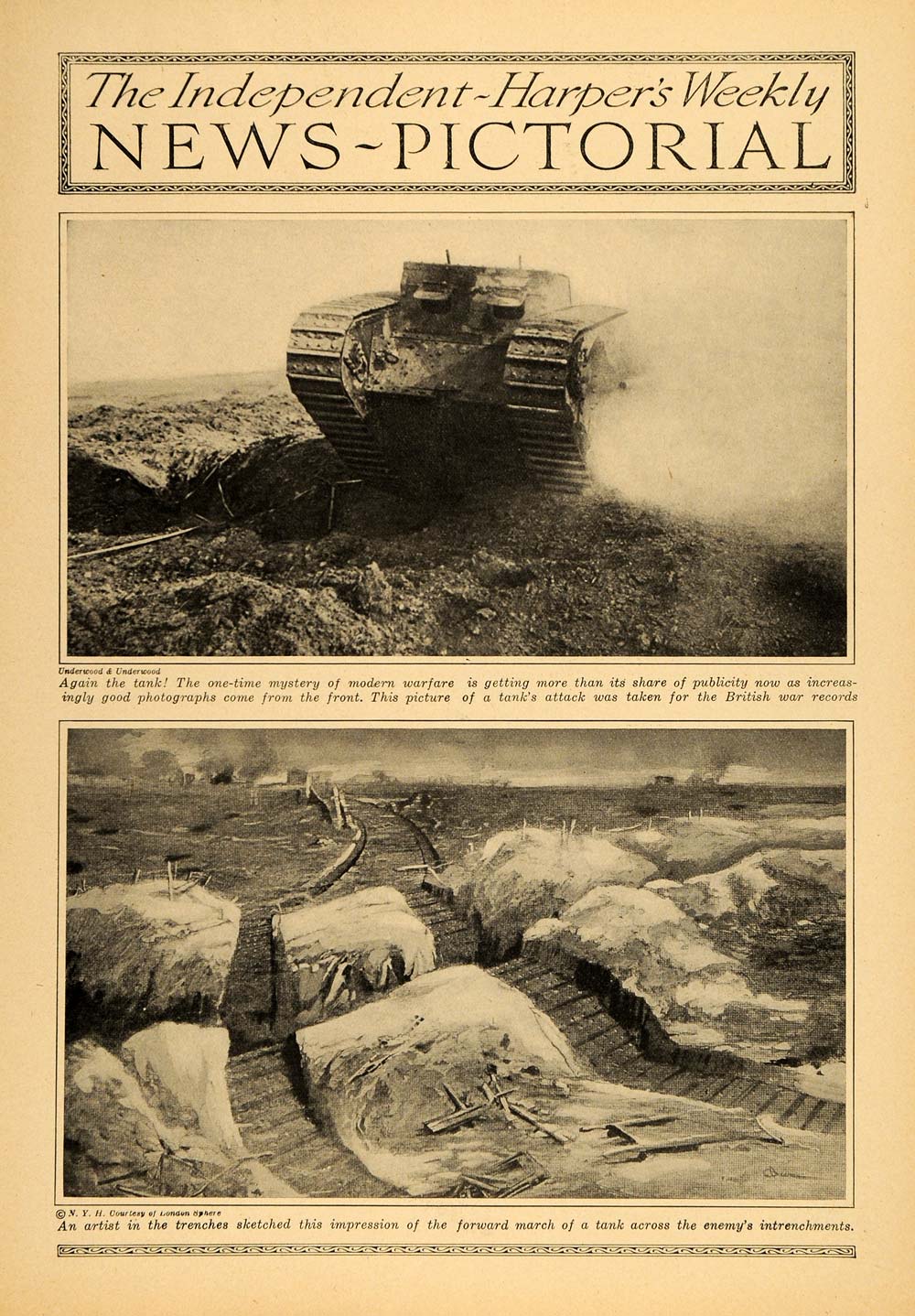 This is an original 1916 halftone print showing a tank of modern warfare, this photograph was taken for British war records. The bottom picture is an artist's sketch of an impression of the forward march of a tank across the enemy's intrenchments.