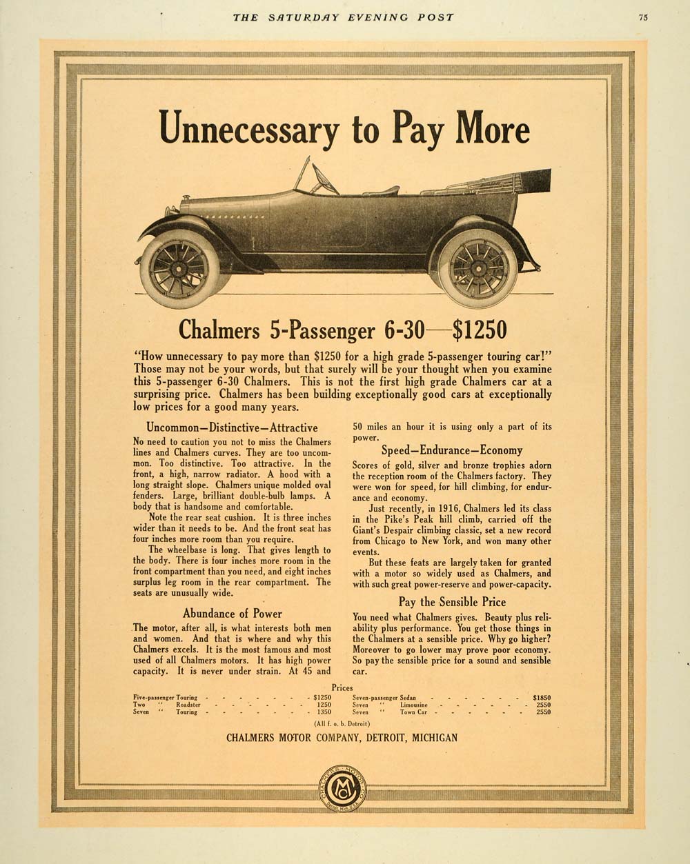 This is an original 1917 color print ad for the Chalmers Five-Passenger 6-30 automobile. Chalmers Motor Car Company was based in Detroit, Michigan and named after Mr. Hugh Chalmers of the National Cash Registry Company. While the company prospered during the early 1900s, it began to go under after World War I, thus merging with the Maxwell Automobile Company. The company ended its automotive production in 1923.