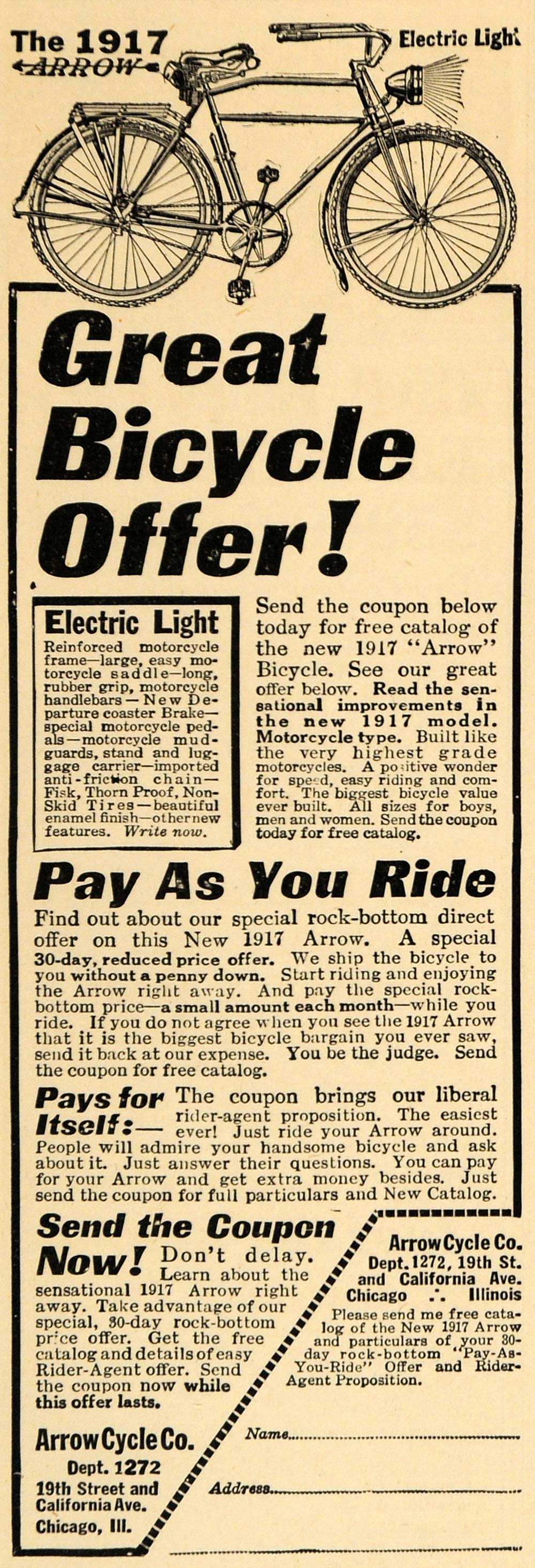 This is an original 1917 black and white print ad for the Arrow Bicycle with Electric Light, a product by Arrow Cycle Company, located at 19th Street and California Avenue in Chicago.