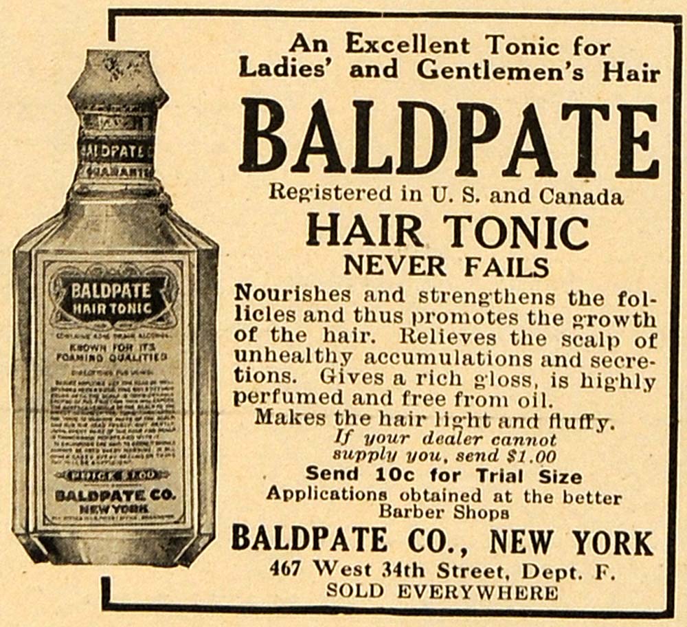 This is a small original 1917 black and white print ad for the Baldpate Hair Tonic, a hair loss treatment for men and women.