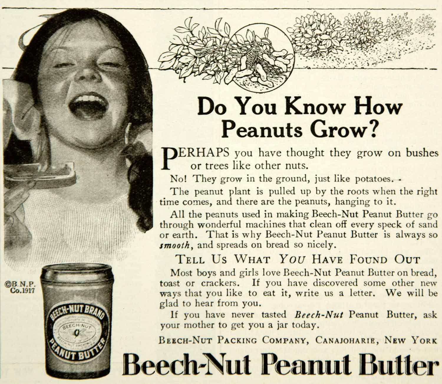 This is an original 1917 black and white print ad for Beech-Nut Peanut Butter from the Beech-Nut Packing Company in Canajoharie, New York.
