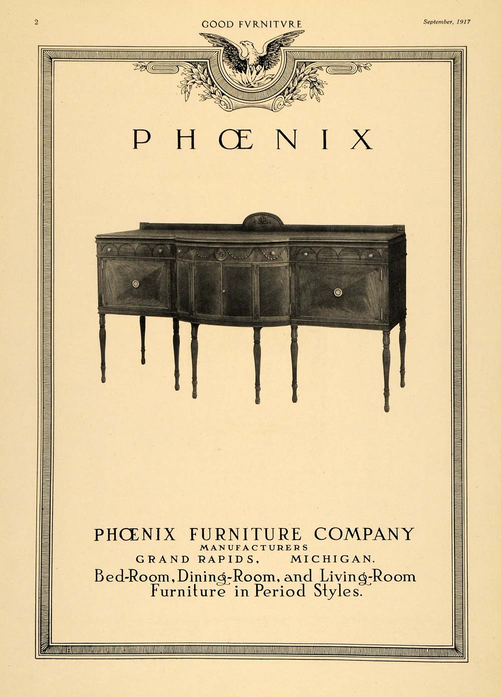 This is an original 1917 black and white print ad for a buffet table and other furniture by the Phoenix Furniture Company located in Grand Rapids, Michigan.