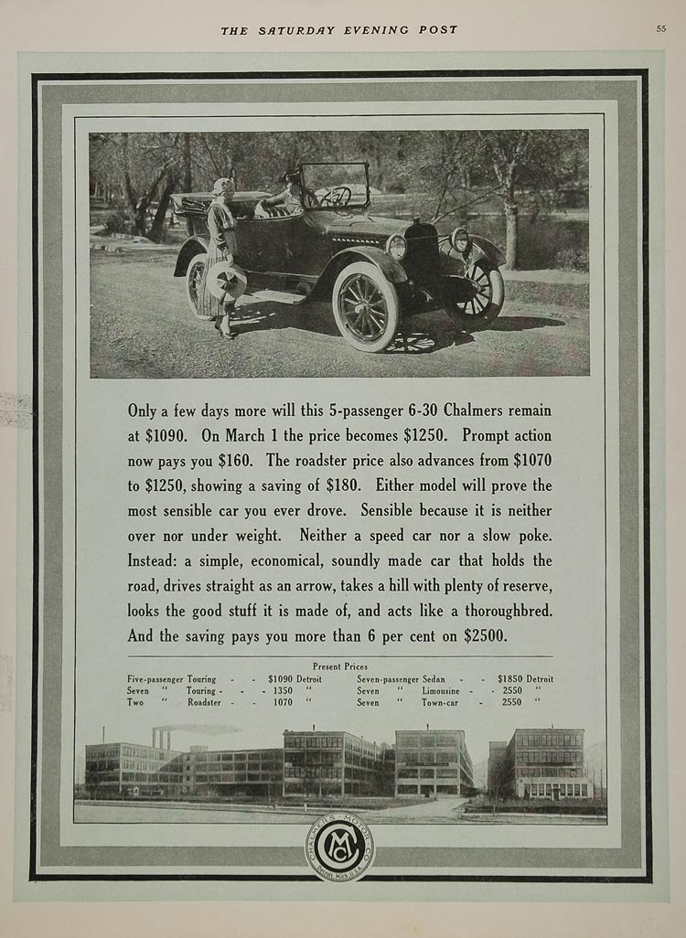 This is an original 1917 two-color print ad for the Chalmers 5-Passenger 6-30 Touring automobile from the Chalmers Motor Company, Detroit. The ad has a nice image of the Chalmers plant in Detroit. This is a great framable print item for the collector of one of these rare cars!