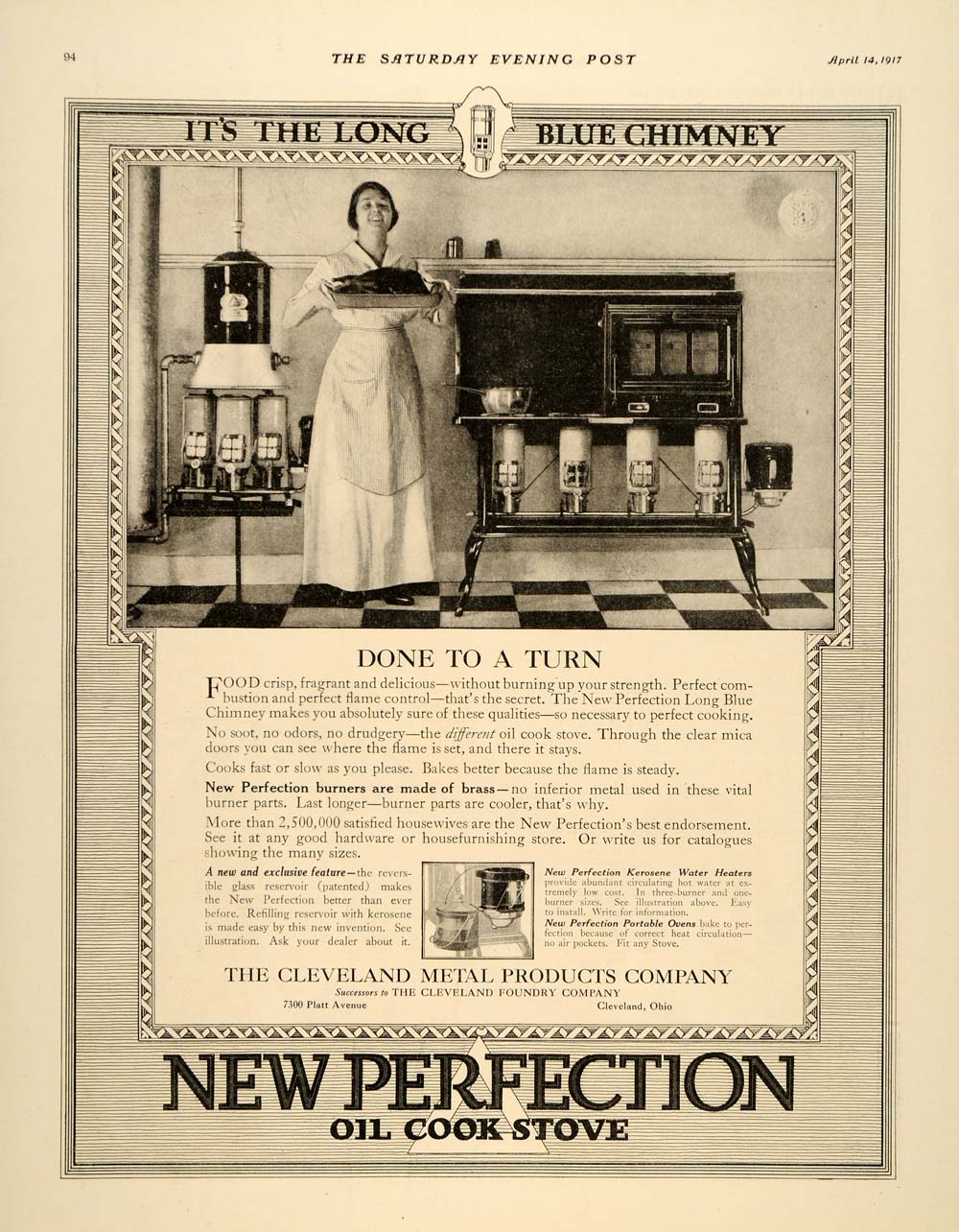 This is an original 1917 black and white print ad for the Cleveland Metal Products Company, the Successors to the Cleveland Foundry Company, located at 7300 Platt Avenue in Cleveland, Ohio. This ad features the New Perfection Oil Cook Stoves, and the New Perfection Long Blue Chimney.