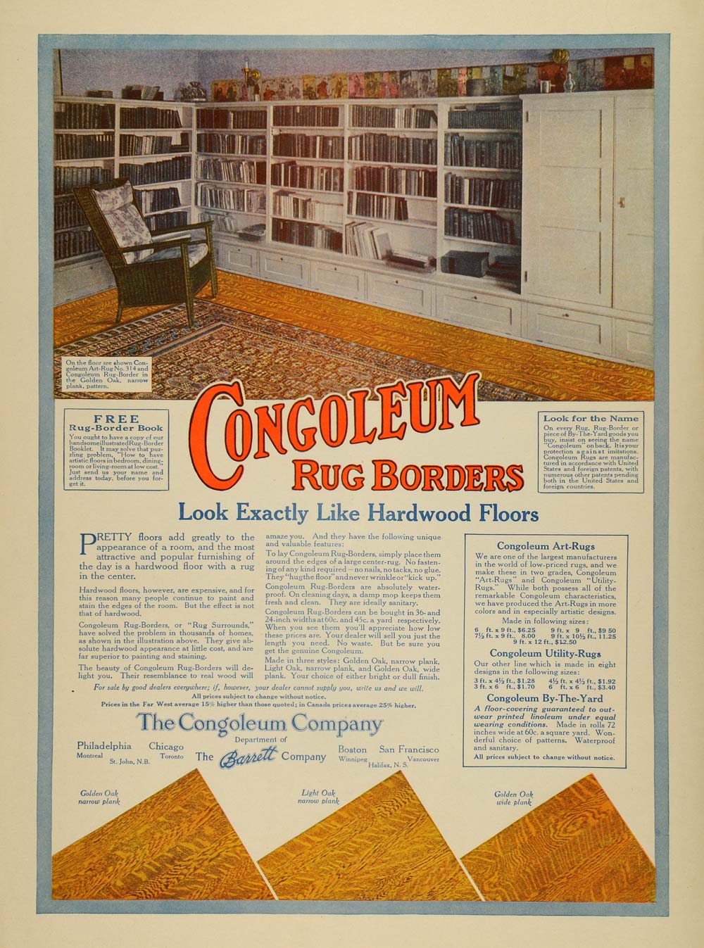 This is an original 1917 World War I era color print ad for Congoleum Rug Borders by The Congoleum Company, a department of The Barrett Company.