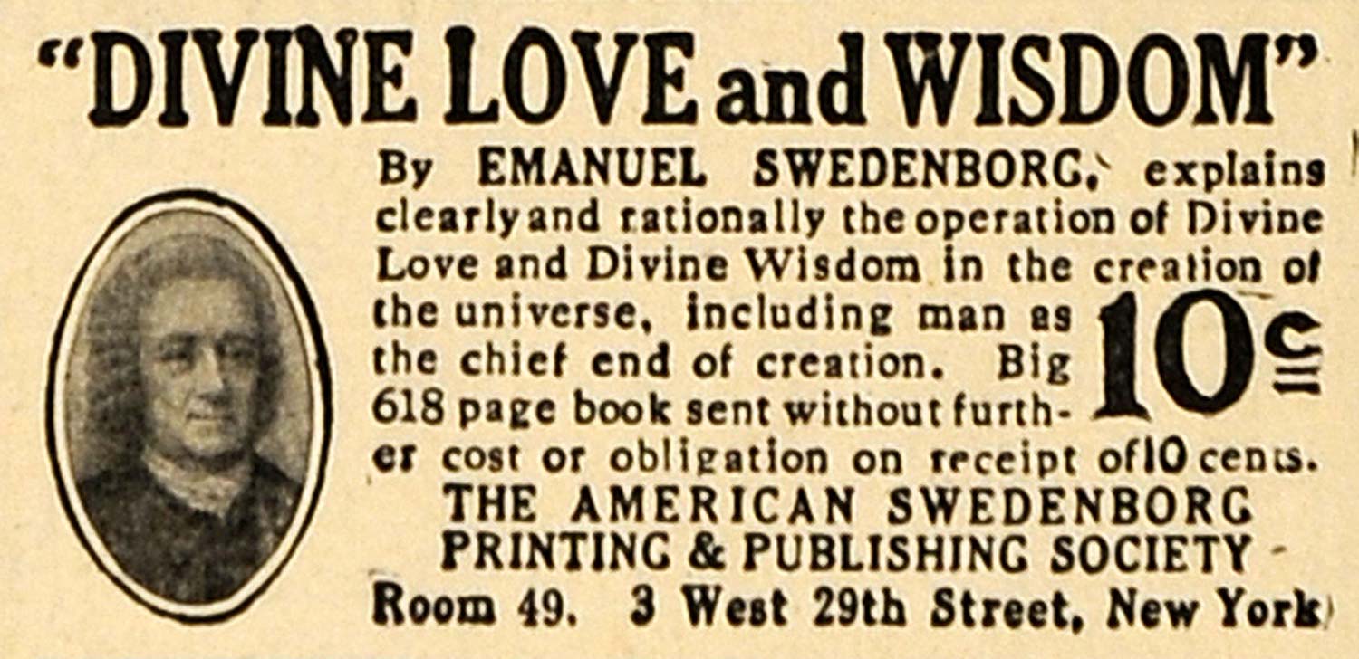 This is a tiny original 1917 black and white print ad for "Divine Love and Wisdom" by Emanuel Swedenborg, a book published by The American Swedenborg Printing and Publishing Society, located at 3 West 29th Street in New York.