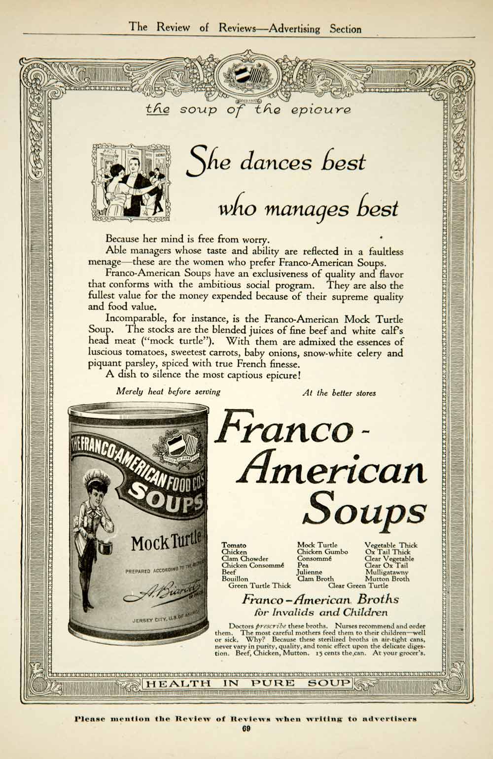 This is an original 1917 black and white print ad for Mock Turtle soup that was made and sold by the Franco-American Food Company during the World War I era.