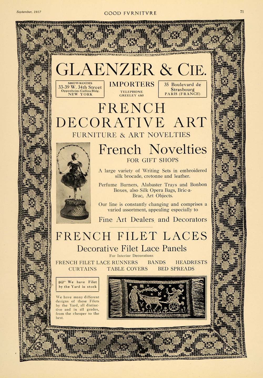 This is an original 1917 black and white print ad for Glaenzer & Cie., importers of French decorative art, furniture and art novelties. Show rooms located at 33-39 West 34th Street, Oppenheim-Collins Building, New York City and 35 Boulevard de Strasbourg, Paris, France.