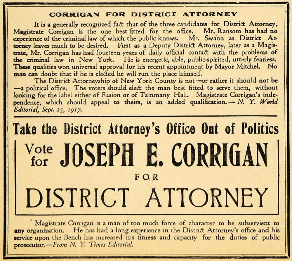 This is an original 1917 black and white print ad for Joseph E. Corrigan as District Attorney. The ad writes, "He is energetic, able, public-spirited, utterly fearless... No man can doubt that if he is elected he will run the place himself."