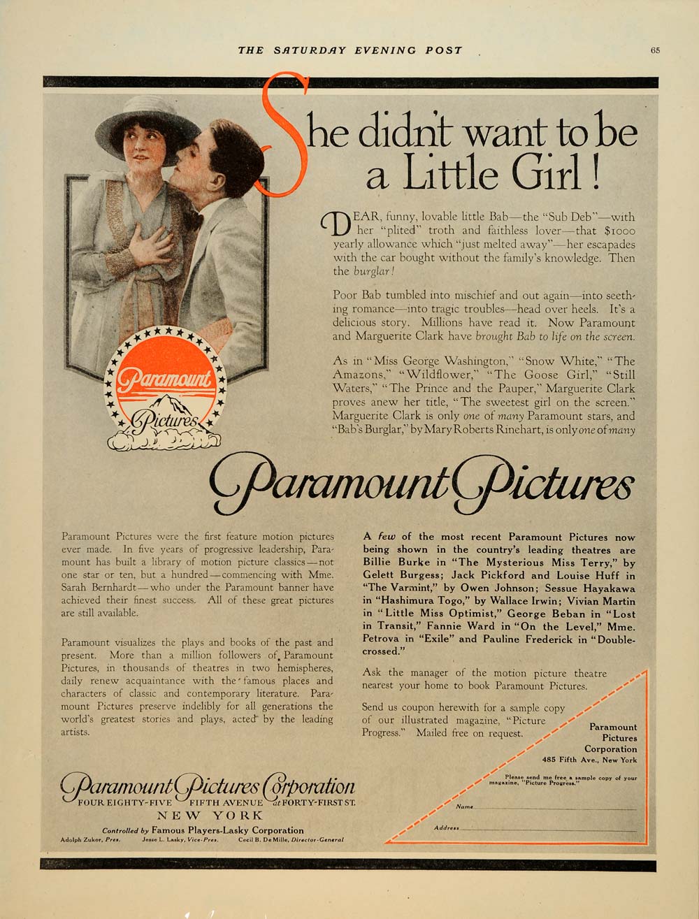 Keywords specific to this image: Marguerite Clark, Little Girl, Cincinnati, Pickford, Huff, Beban, Lasky, DeMille, Zukor, Sarah Bernhardt, Rinehart Vintage Advertising