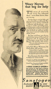 This is an original 1917 black and white print ad for Sanatogen. The ad features quotes from Colonel Henry Watterson and Arnold Bennett.