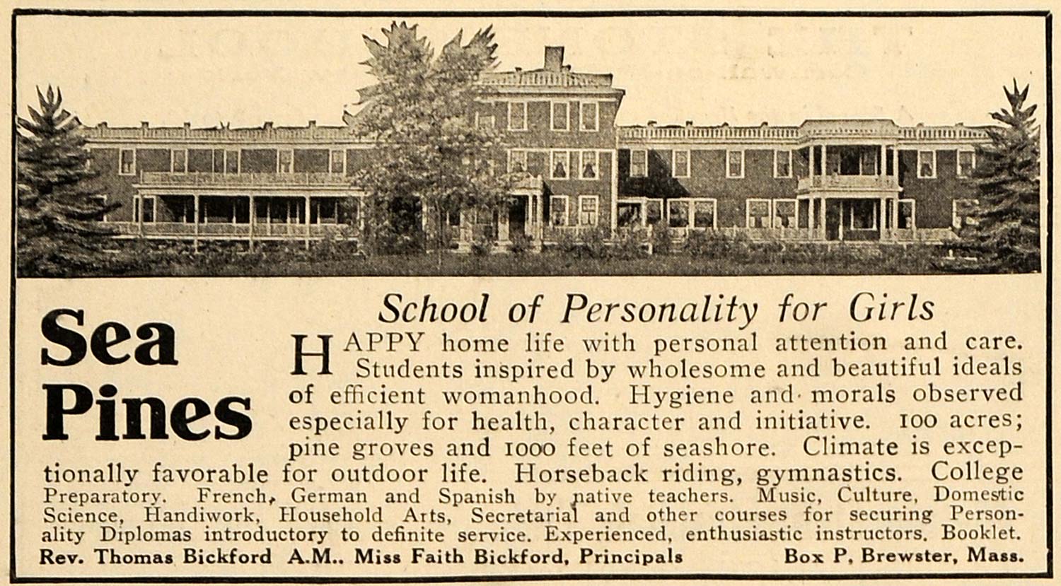 This is an original 1917 black and white print ad for the Sea Pines School of Personality for Girls located in Box P, Brewster, Massachusetts with Rev. Thomas Bickford and Miss Faith Bickford as the principals.