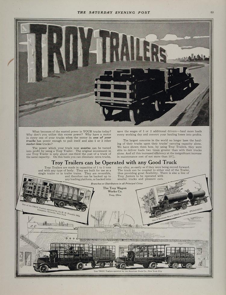 This is an original 1917 black and white print ad for Troy Trailers from The Troy Wagon Works of Troy, Ohio. The ad has several nice illustrations of vintage trucks pulling Troy trailers: a Troy trailers operated by the H. H. Franklin Mfg. Co., Syracuse, N.Y.; one of Stedman Bent's Troy trailers in Philadelphia; and two Troy trailers operated by the American Dock Co., New York City.