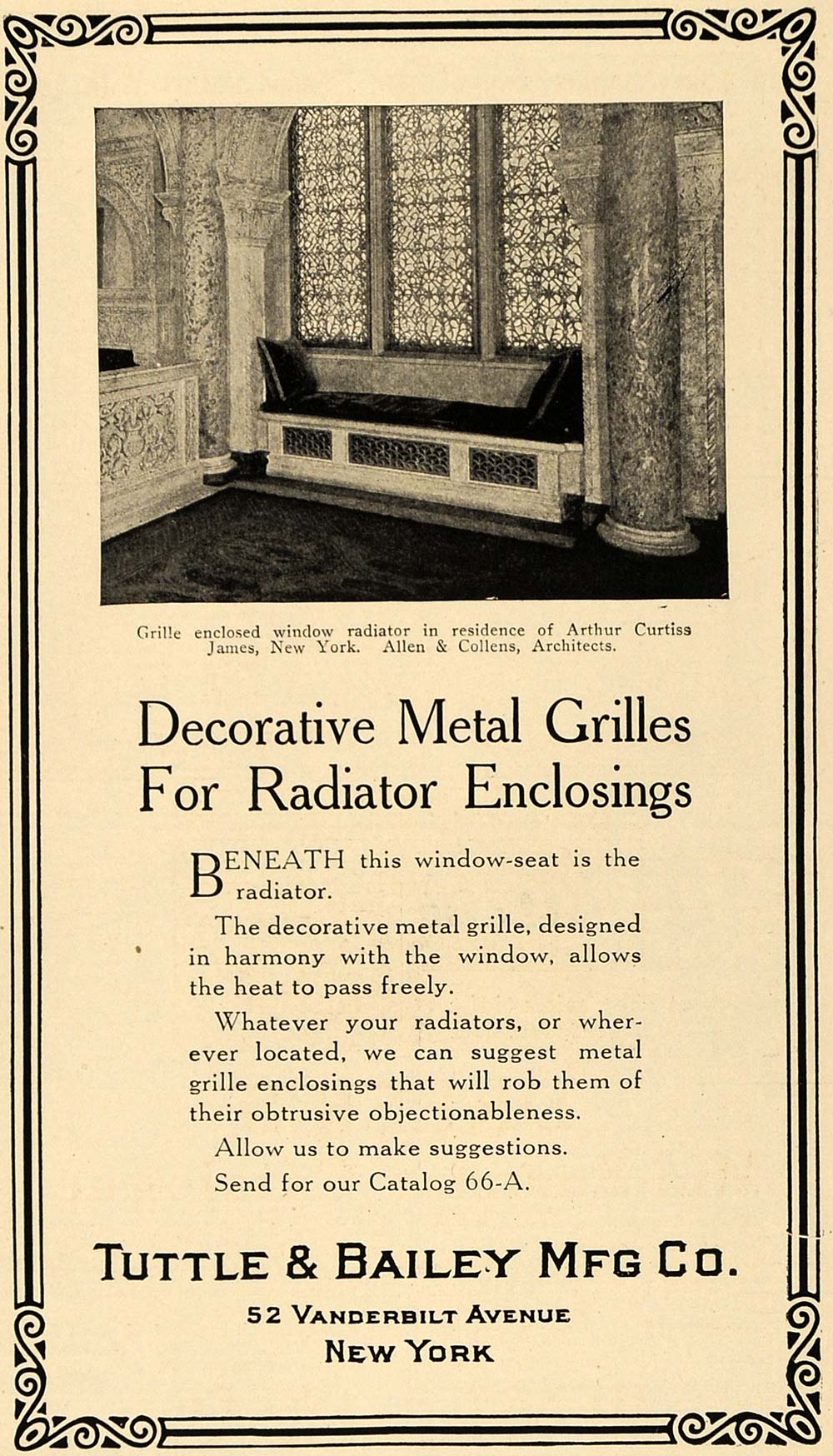 This is an original 1917 black and white print ad for decorative metal radiator grills from the Tuttle and Bailey Manufacturing Company. The ad features a radiator cover from the home of Arthur Curtiss James.