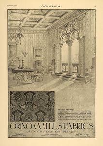 This is an original 1917 black and white print ad for Orinoka Mills Fabrics located at 215 Fourth Avenue, New York City.