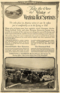 This is an original 1917 black and white print ad for the Virginia Hot Springs. They were built in 1766 by Thomas Bullitt, the luxury resort hosted an array of United States Presidents. Around 1888, J.P. Morgan and his investors rebuilt the hotel from the ground up; however the building was destroyed in a fire in 1901, thereafter, the present Homestead hotel was erected. During World War II, Japanese diplomats were housed at the Homestead until American counterparts were returned. In 1991, The Homestead was deemed a National Historic Landmark. In 1993, the owners of the Pinehurst Resort purchased the Homestead.