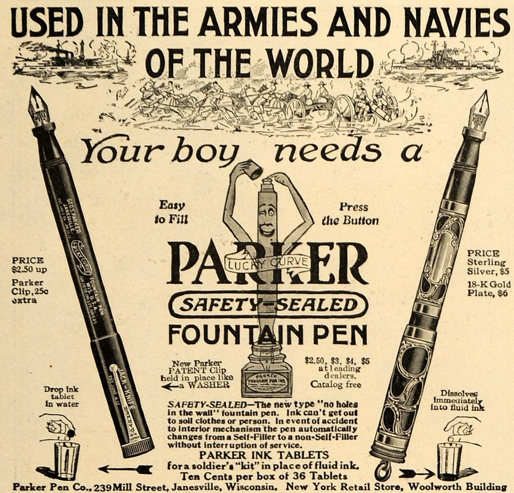 1917 Ad WWI Army Navy Parker Fountain Pen Janesville - ORIGINAL ADVERTISING TIN3