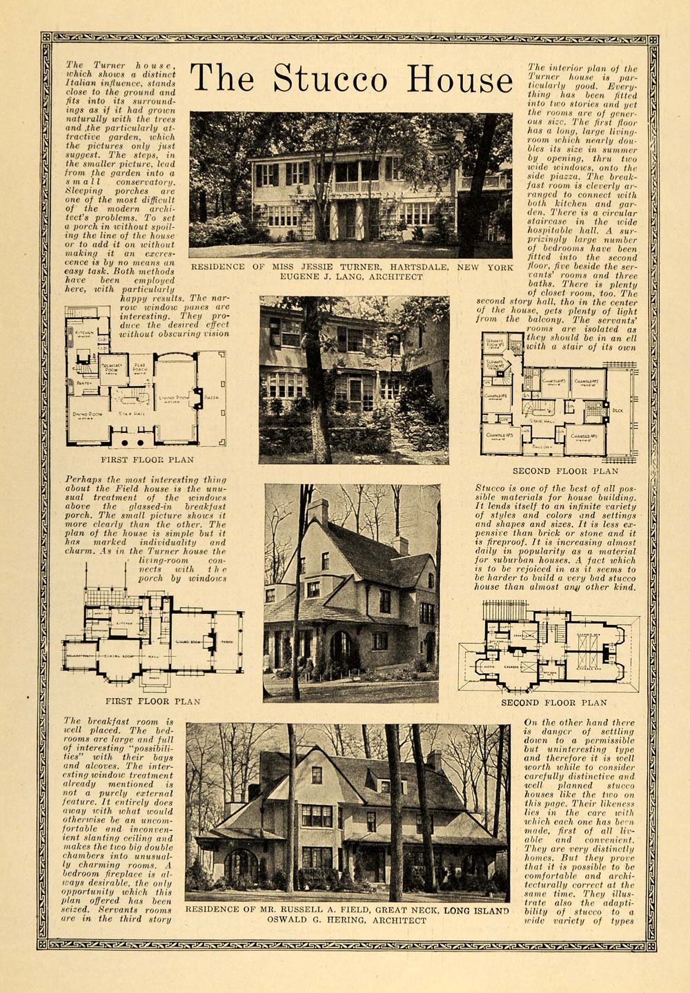 This is an original 1917 1 page article titled, "The Stucco House". The ad features images of the residences of Miss Jessie Turner of Hartsdale, New York, and of Mr. Russell A. Field of Great Neck, Long Island. The architects are Eugene J. Lang, and Oswald G. Hering, respectively.