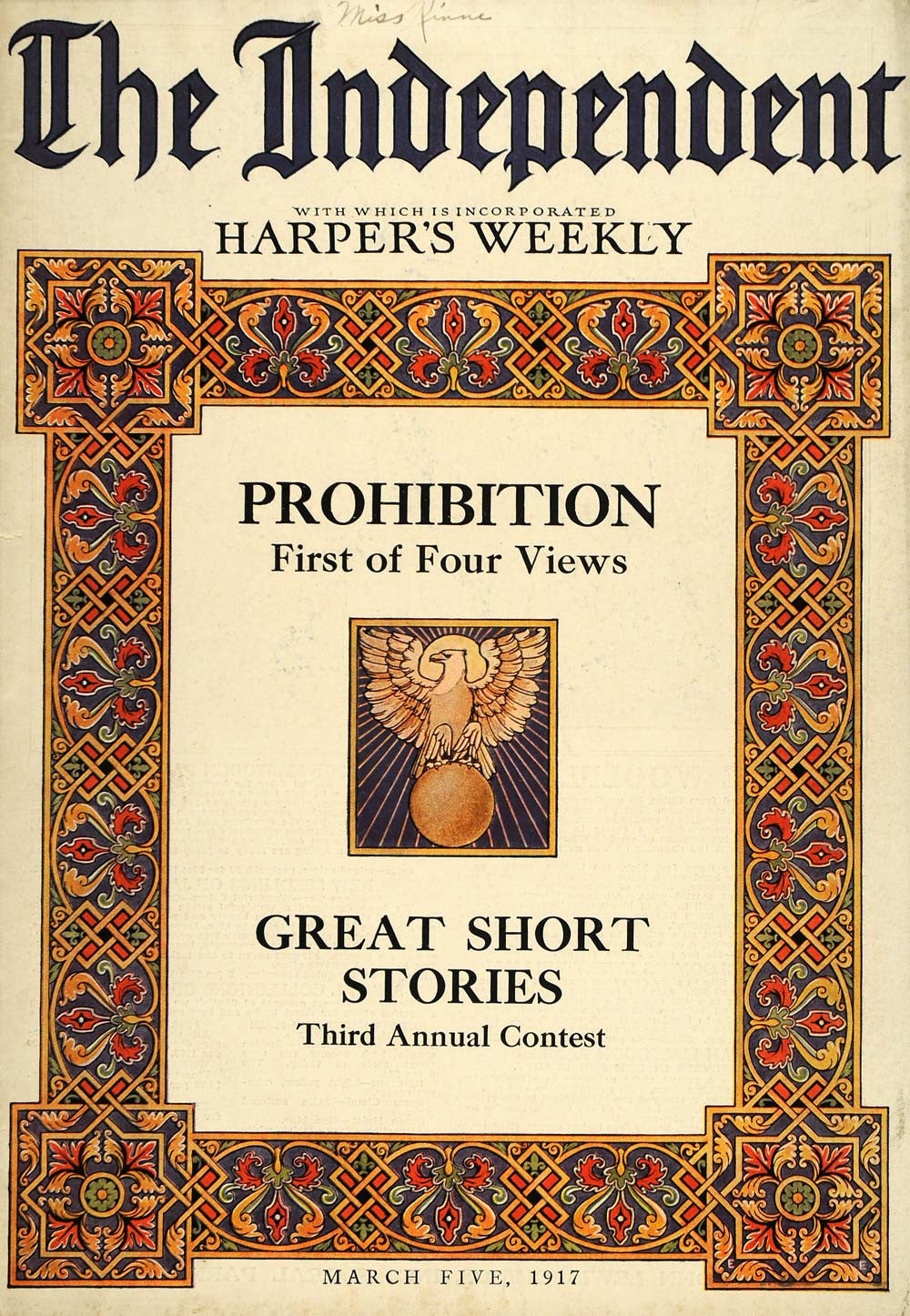This is an original 1917 color cover for The Independent Magazine which is incorporated with Harper's Weekly. This magazine had it's third annual short story writing contest, with the results in the magazine. It also had four different views of Prohibition.CONDITION