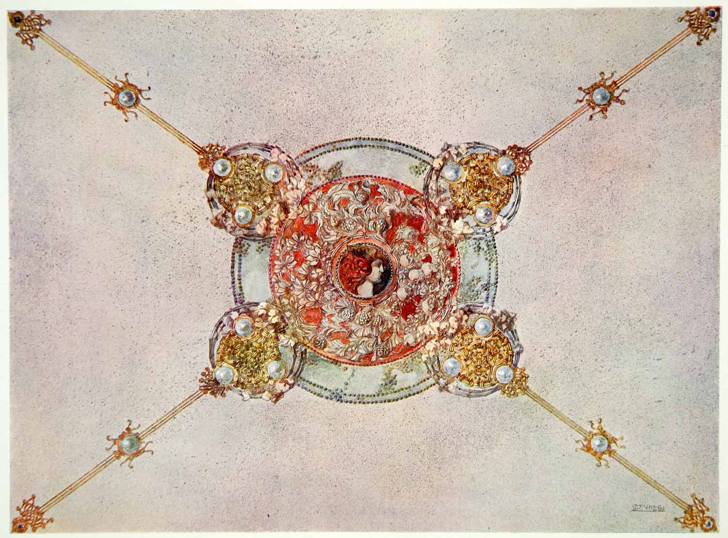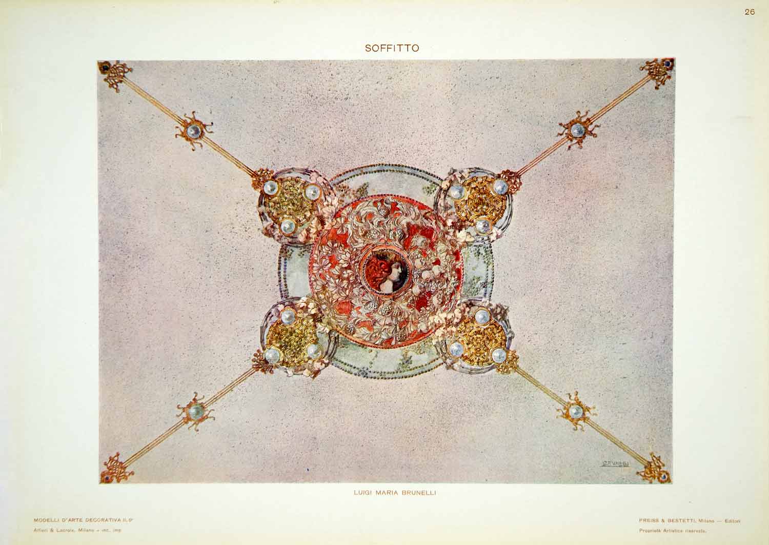 This is an original 1917 color photolithograph of an Art Nouveau ceiling by Luigi Maria Brunelli.