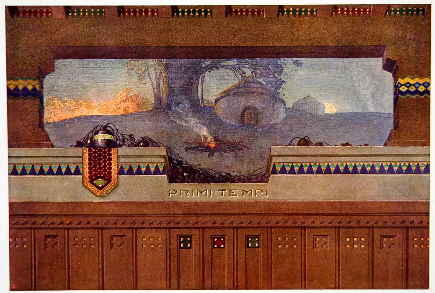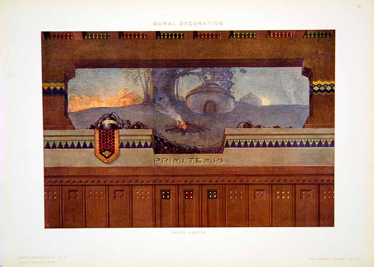 This is an original 1917 color photolithograph of an Art Nouveau decorative mural painting by Oreste Albertini.