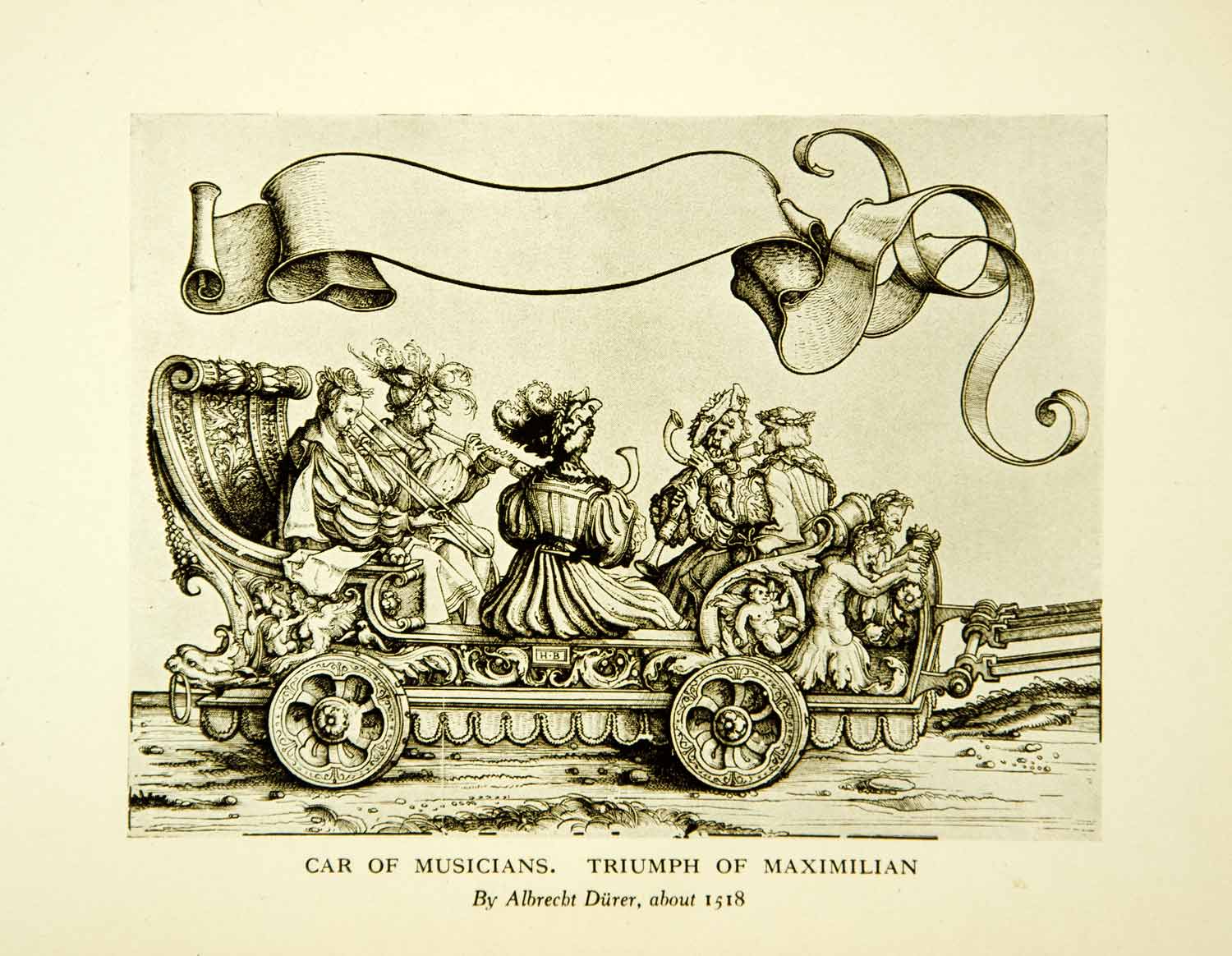 This is an original 1917 black and white halftone print of wood block art by Albrecht Dürer that was part of a 16th century series known as the "Triumphal Procession" that portrayed a group of musicians on one of the royal carriage cars of Emperor Maximilian I of the Holy Roman Empire.