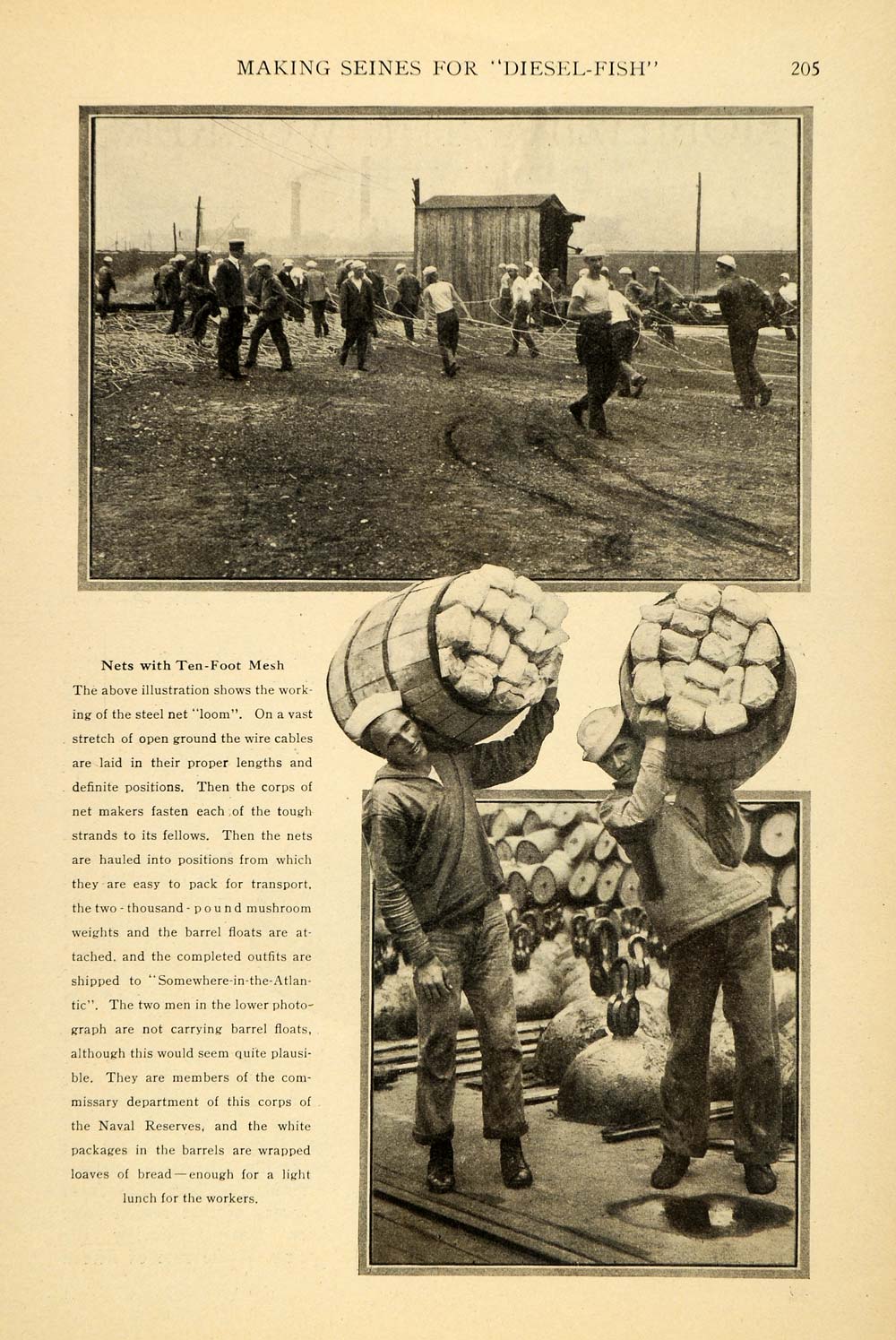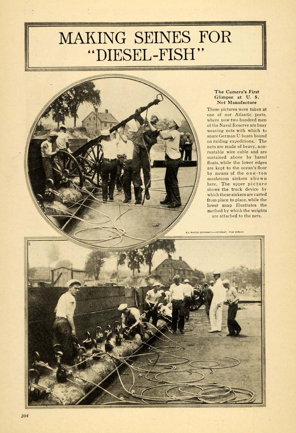 This is an original 1917 2-page halftone print set of the United States manufacturing of nets to catch German U-boats during World War I. The images are from the country's Atlantic ocean ports, and these nets are made of non-rustable wire cable.