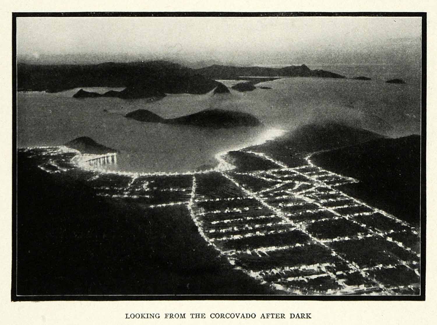 This is an original 1917 halftone print of Rio de Janeiro after dark. The city is ablaze with incandescent light, and In the distance, a thick cloud allows only the peak of Sugarloaf Mountain to be visible.