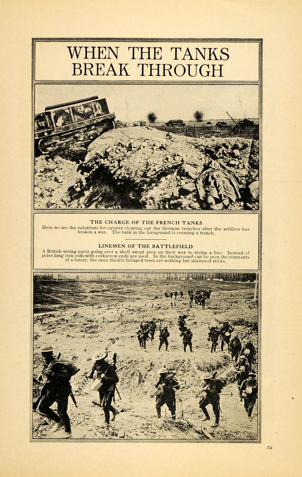 This is an original 1917 halftone print of tanks breaking through army lines in World War I; the images involve the French troops and machinery crossing enemy trenches, and a British wiring party covering a shell swept area in an attempt to string a line.