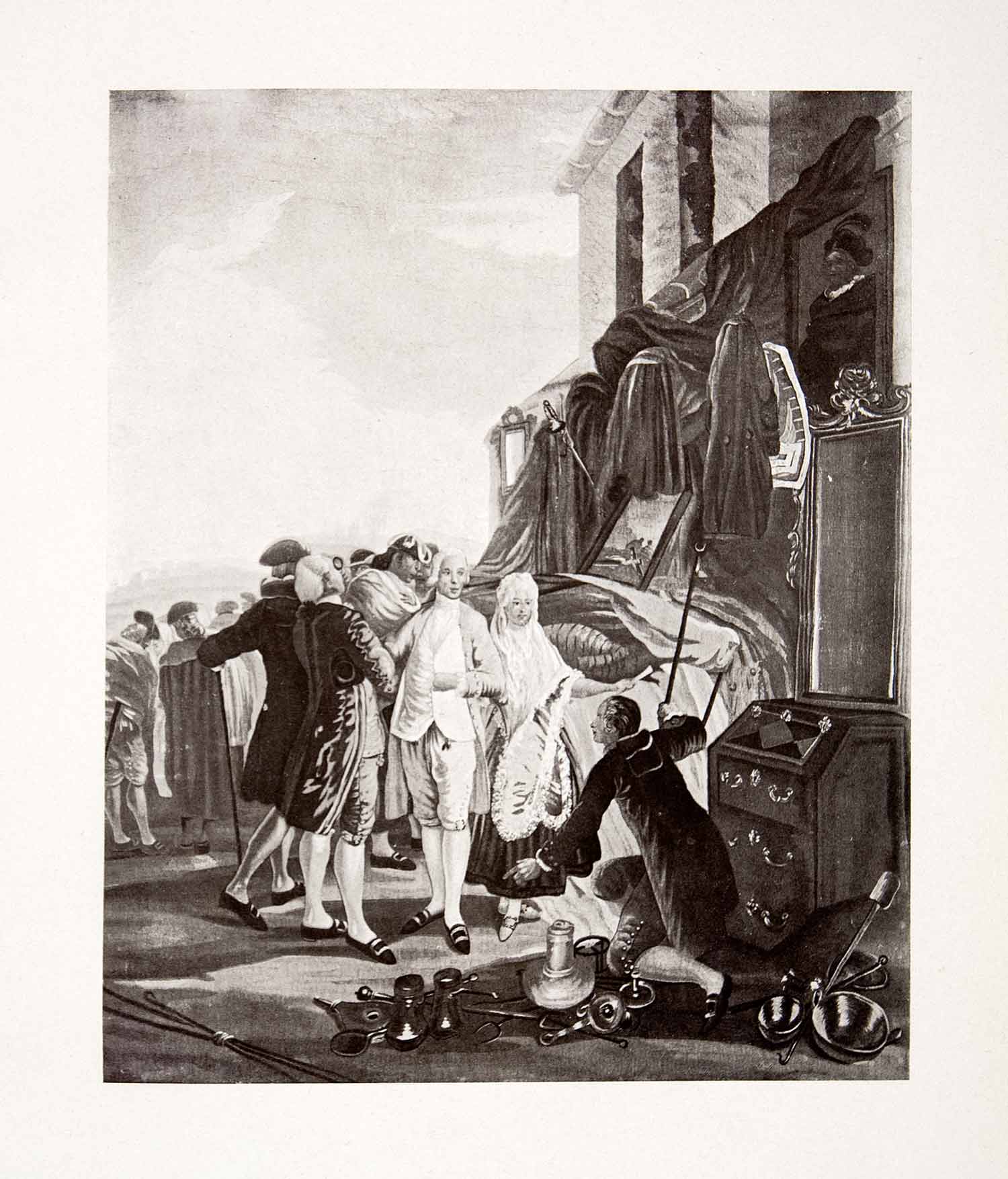 This is an original 1917 black and white halftone print of a tapestry depicting Francisco de Goya's "The Old Curiosity Shop." The textile in this print was produced at the Royal Tapestry Factory in Madrid, Spain. This factory has been producing tapestries since 1720 when it was founded by King Philip V.