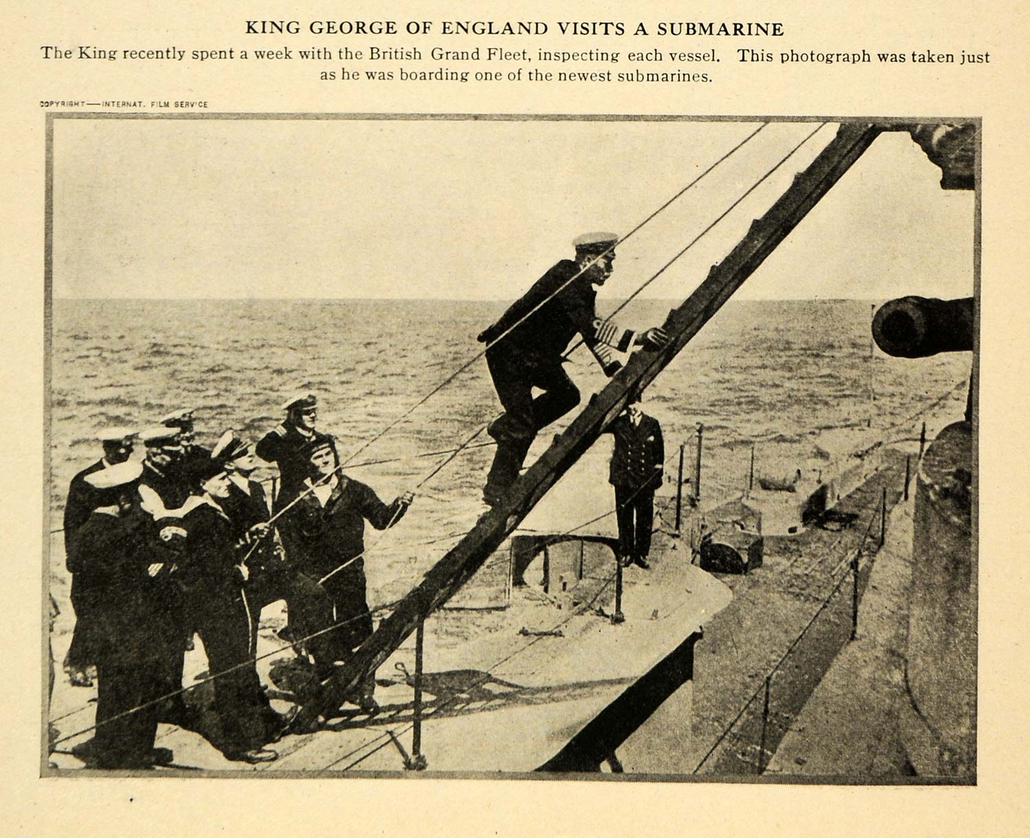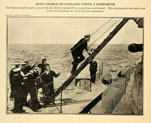 This is an original 1917 halftone print of King George of England taking a gander at a submarine during World War I; he spent some time with the British Grand Fleet and inspected each vessel.