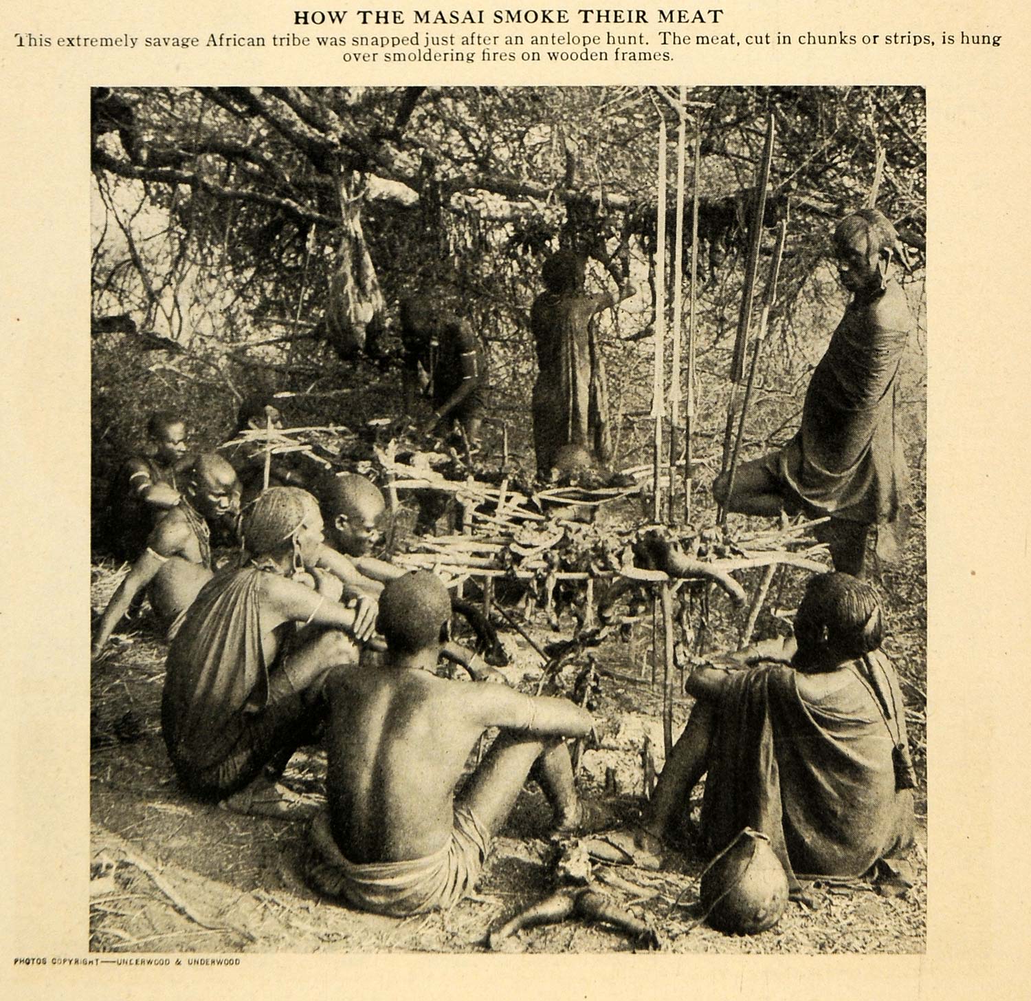 This is an original 1917 halftone print of the Masai tribe of Africa, just after an antelope hunt during their process of smoking meats.