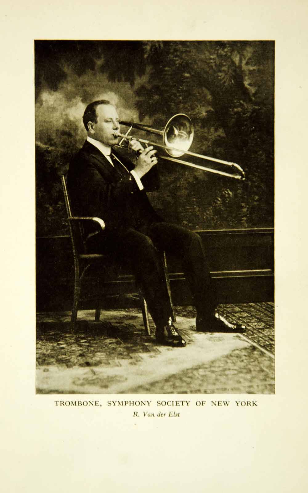 This is an original 1917 black and white halftone print of a portrait of trombonist R. Van der Elst who performed with the New York Symphony Orchestra.