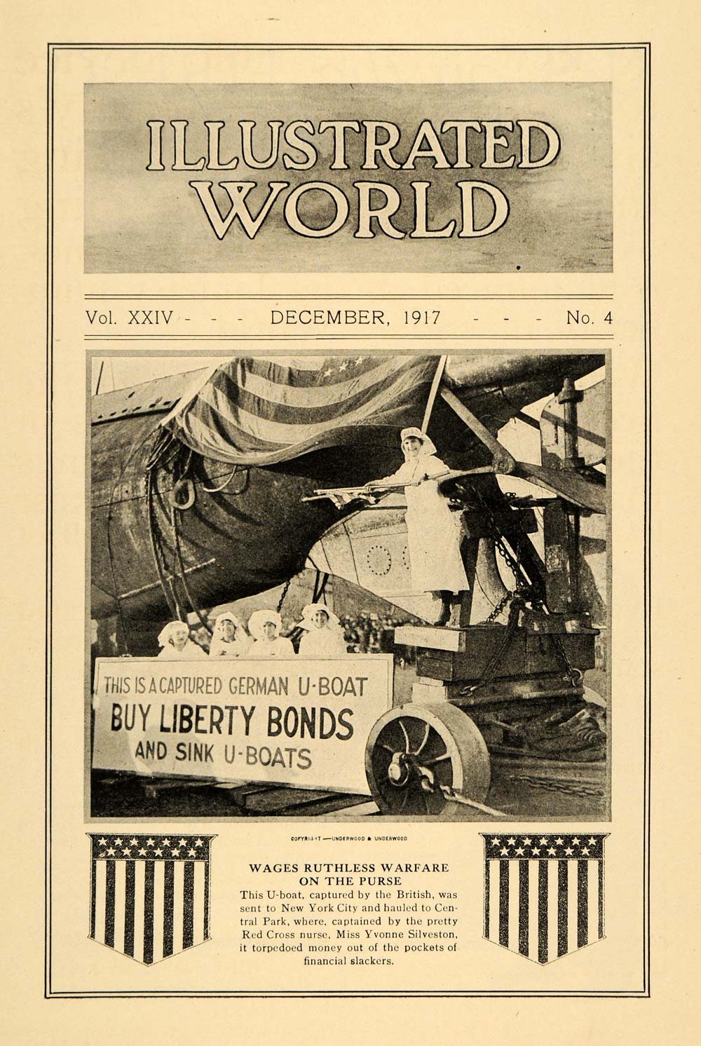 This is an original 1917 halftone print of a German U-boat, captured by the British, on display in Central Park in New York City and accompanied by Red Cross nurses, including Miss Yvonne Silveston.