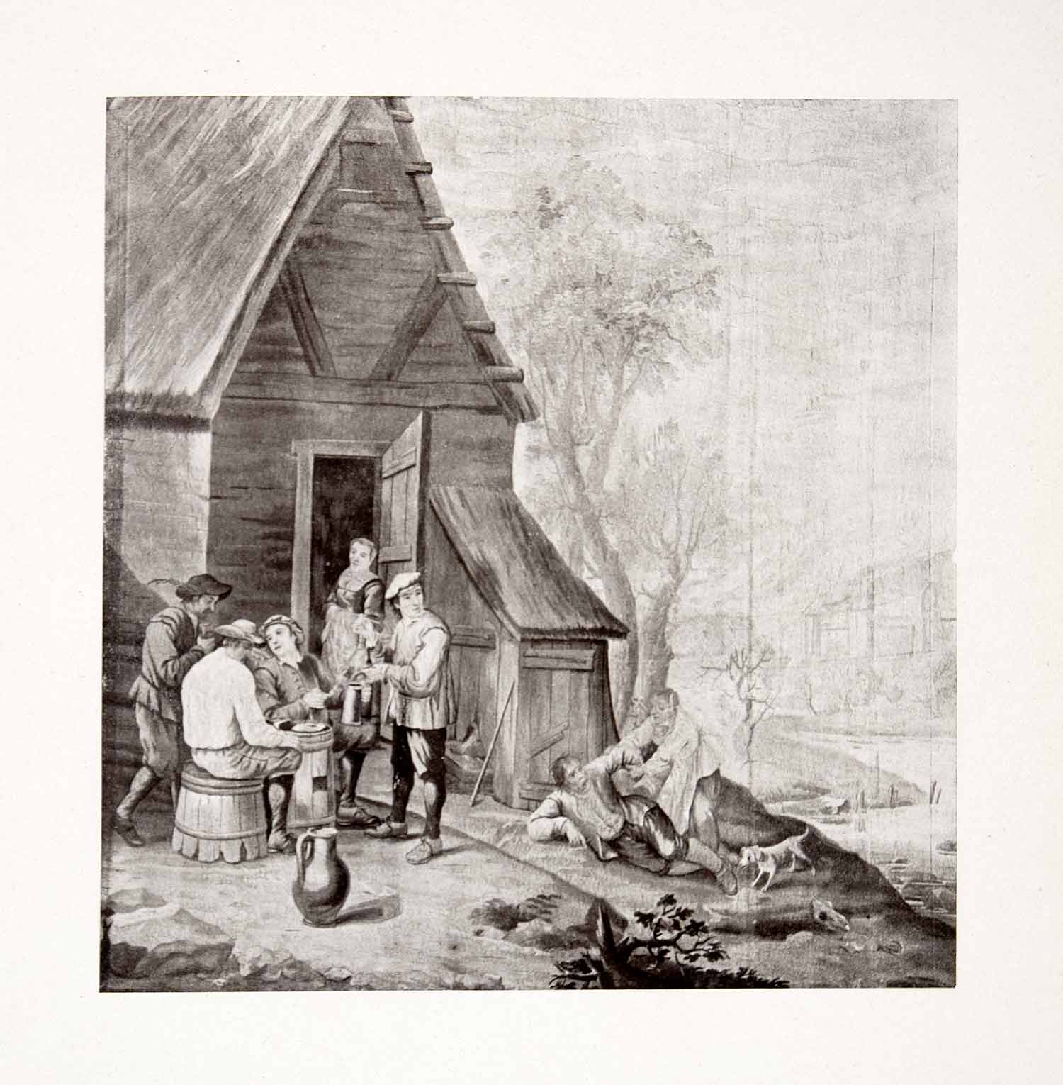This is an original 1917 black and white halftone print of a tapestry that was created after the painting entitled "The Drinkers" by David Teniers and was possibly designed by Jacob Wandergoten's sons. The textile in this print was produced at the Royal Tapestry Factory in Madrid, Spain. This factory has been producing tapestries since 1720 when it was founded by King Philip V.