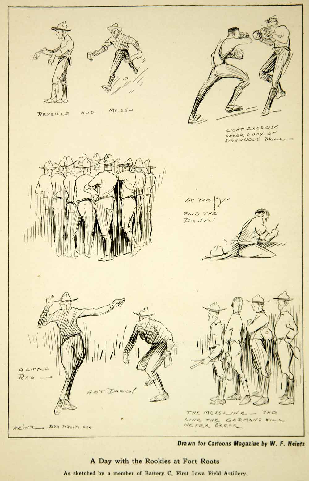 1917 Print World War I Cartoon Fort Roots Training Camp Soldiers W. F. Heintz