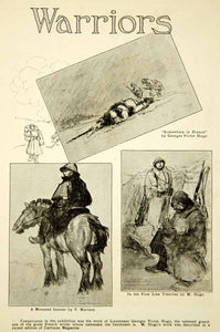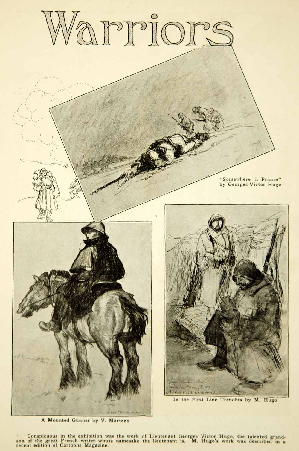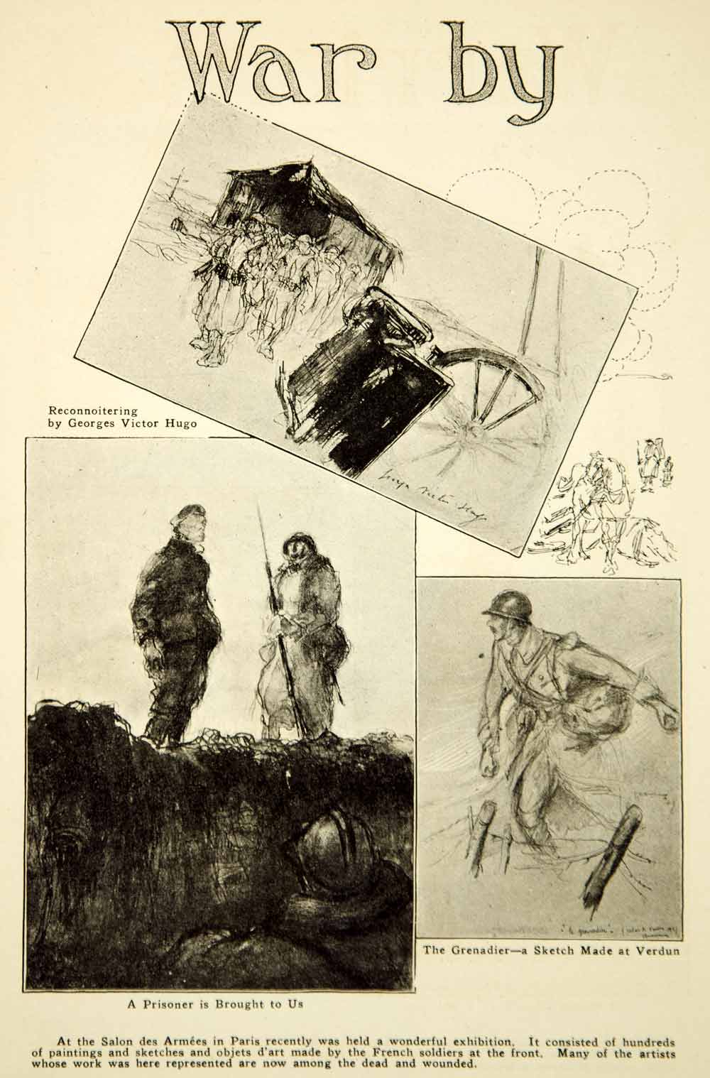 This is an original 1917 two-page black and white halftone print of World War I paintings and sketches drawn by French soldiers at the front lines and shown at an exhibit at the Salon des Armées in Paris. Conspicuous in the exhibition was the work of Lieutenant Georges Victor Hugo, grandson of the great French writer. Please see both images.