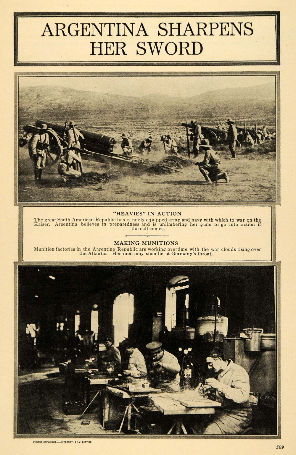 This is an original 1917 halftone print of the South American Republic's army and navy with its war artillery, as well as a scene from a munitions factory in the Argentine Republic.