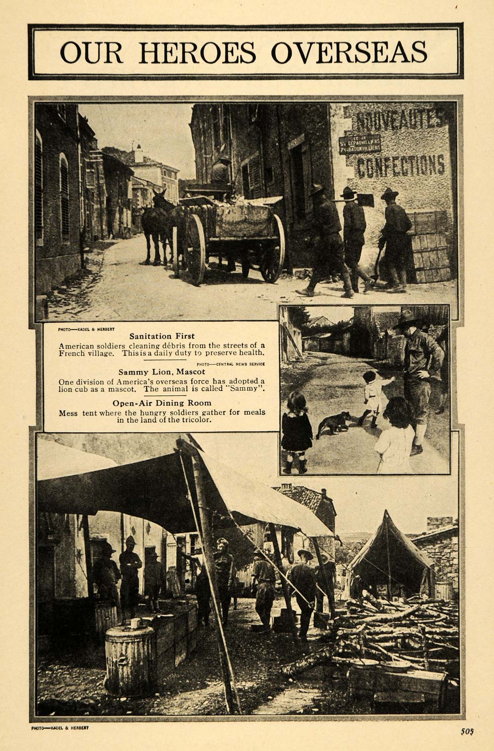 This is an original 1917 halftone print of American soldiers cleaning debris from French streets to preserve sanitary health conditions, as well as Sammy the lion cub mascot and the Mess Tent where soldiers gather for mealtime.
