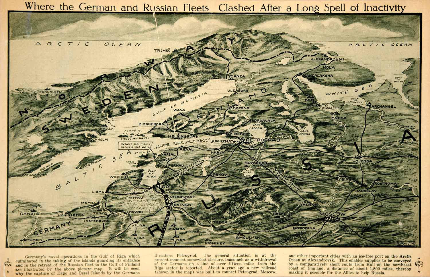 This is an original 1917 duotone rotogravure of a map of the Baltic Sea and the German-Russian battle line as of October 26, 1917 during World War I.