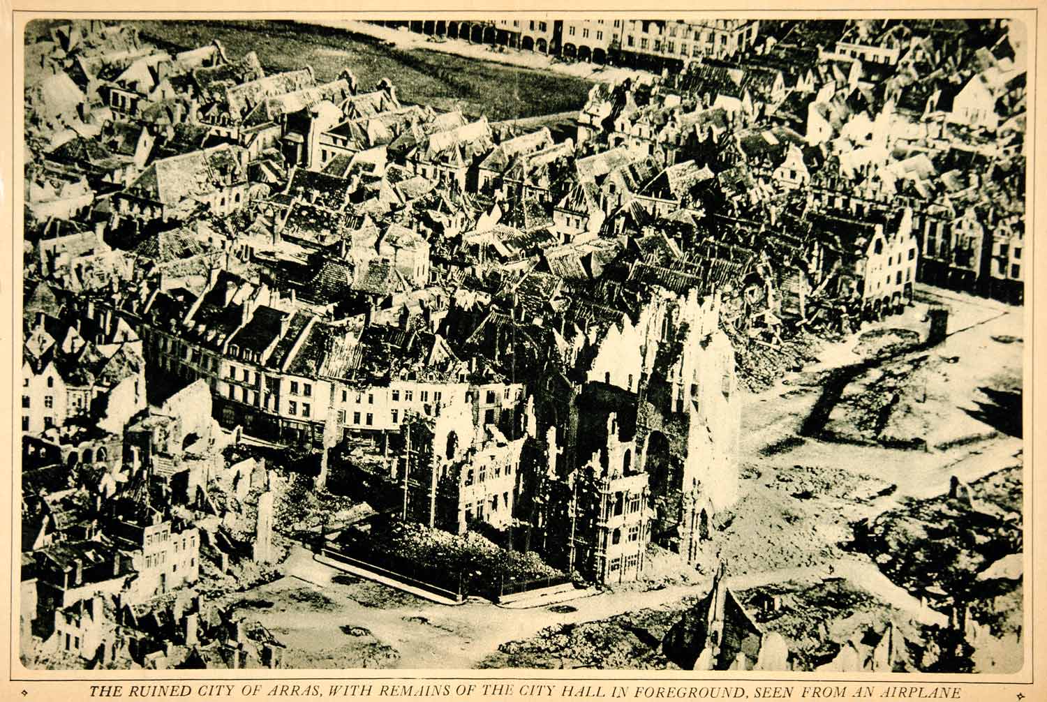 This is an original 1917 duotone rotogravure with an aerial view of the destroyed city of Arras, France during World War I.