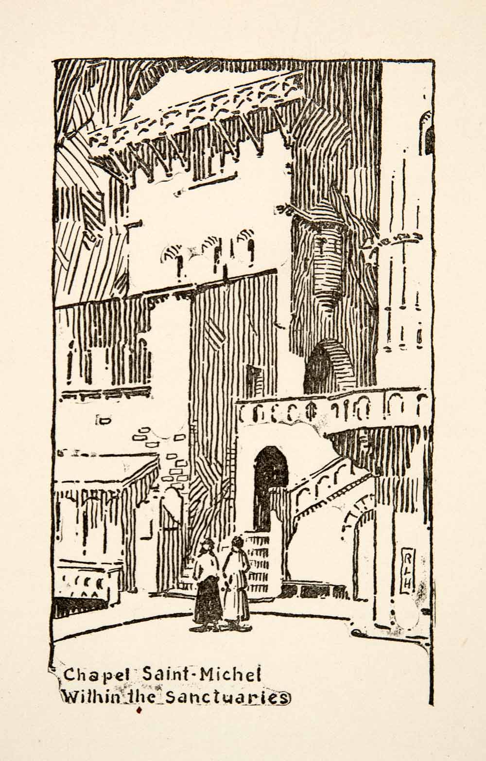 This is an original 1917 black and white in-text wood engraving of the "Chapel of Saint Michel Within the Sanctuaries," in France.