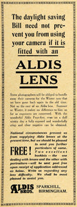 This is an original 1918 black and white WWI-era print ad for British-made camera lenses from Aldis Brothers, Sparkhill, Birmingham, England. The daylight saving Bill will not prevent the use of the camera during winter if it is fitted with these lenses.